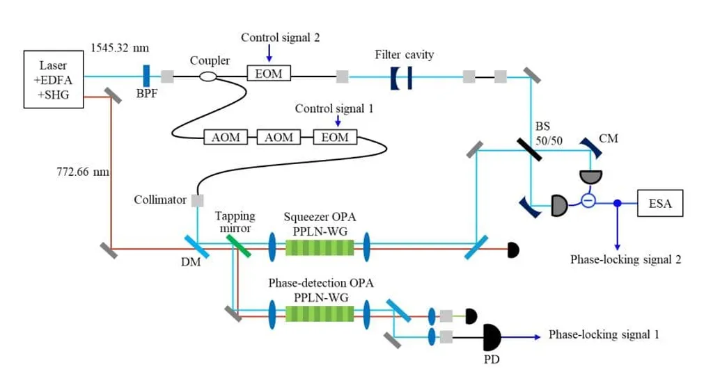 To achieve this, the team introduced a novel phase detection technique that eliminates the need to tap a part of the squeezed light to obtain a phase-locking signal. Instead, they employed a phase-detection OPA seeded by a tapped probe and pump light before the squeezer OPA. This innovative configuration addresses the conventional trade-off between generating a high-signal-to-noise ratio phase-locking signal and minimizing the degradation of the squeezing level caused by optical tapping.