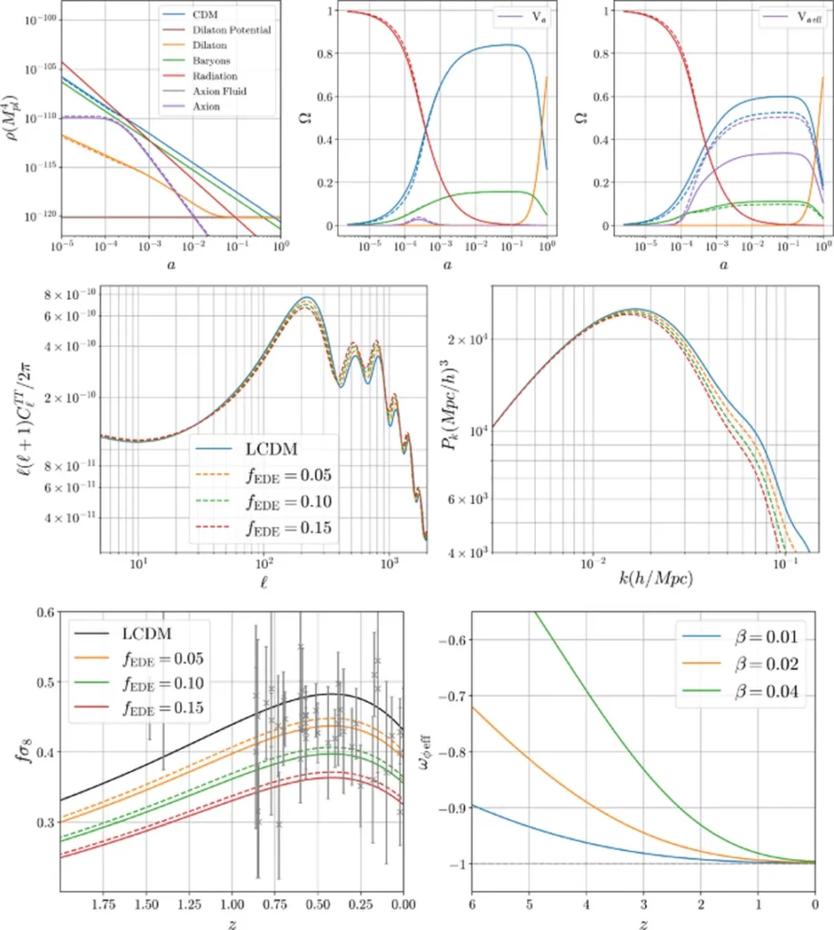 The researchers have investigated a model where the axion, a hypothetical particle, constitutes all of the dark matter, and the dilaton, another hypothetical particle, acts as a dark energy field. This model is well-motivated by fundamental physics and offers a unique perspective on the evolution of the universe. The team confronted this model with data from the Planck 2018 satellite, the SPT-3G high-ℓ measurements, the DESI DR2 BAO, and the Pantheon+ supernovae, among others.